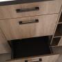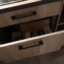 Die Küchenzeile vereint Funktionalität mit modernem Design auf kleinstem Raum. Die Fronten in warmer, strukturierter Eichen-Optik harmonieren perfekt mit der dunklen Arbeitsplatte. Dank der cleveren Aufteilung bietet diese Küche alles, was man für den Alltag benötigt, ohne dabei wuchtig zu wirken.