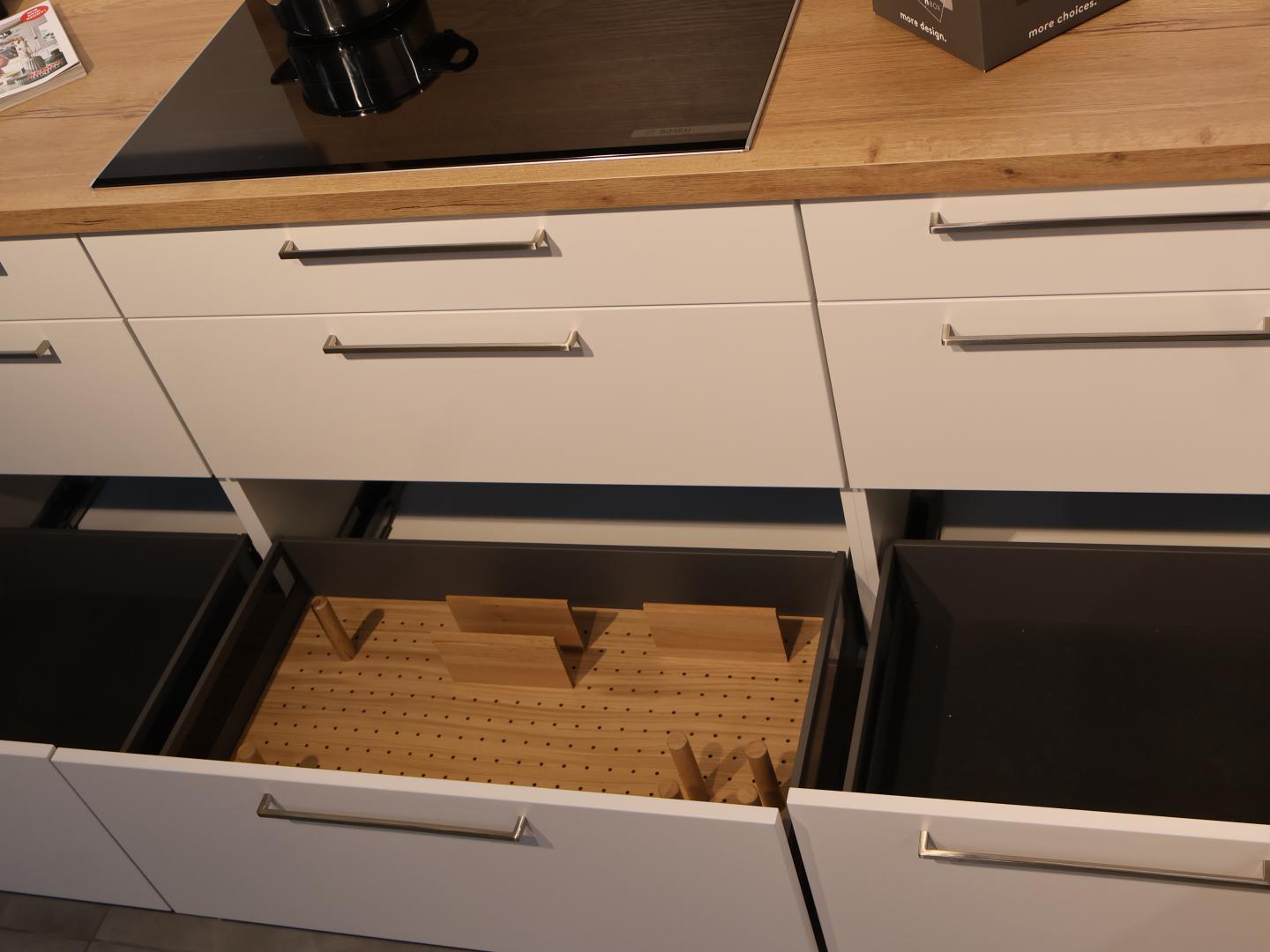 Moderne Eckküche von Nobilia in Mattweiß & Eiche-Optik